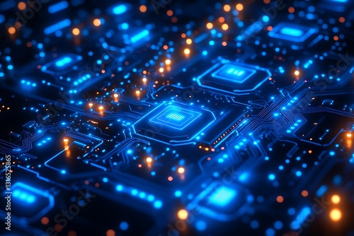 Futuristic Circuit Board Abstract Technology Background with Glowing Blue and Orange LEDs