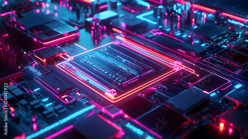 Futuristic circuit board with vibrant neon lights showcasing technology