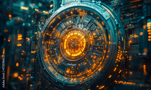 Futuristic circular digital interface with glowing orange data nodes and complex layered technology elements symbolizing advanced automation and productivity solutions in a dark setting