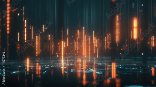 Futuristic city glowing at night with digital lines.