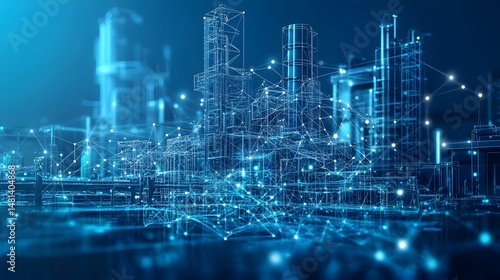 Futuristic city rendered in striking blue wireframe. Towering structures and interconnected networks create a digital landscape suggesting advanced technology. Abstract wireframe in dark blue.