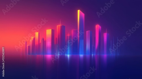 Futuristic city skyline at dusk with vibrant neon lights reflecting on water surface and a colorful gradient sky in the background