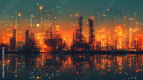 Futuristic city skyline illuminated at dusk with vibrant colors and reflections.
