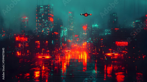 Futuristic city skyline with glowing lights and flying drones in the fog.