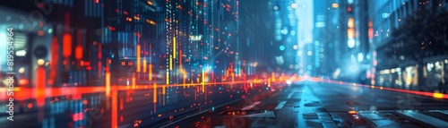 Futuristic city street at night with neon lights and advanced technology architecture, creating a cyberpunk atmosphere, reflections on wet pavement.