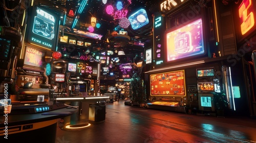 Futuristic city street, neon signs, vibrant nightlife, bustling crowd, game arcade background; video game backdrop