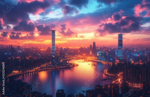 Futuristic Cityscape at Dusk with Modern Bridge Architecture and Vibrant Reflections