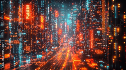 Futuristic cityscape at night with glowing skyscrapers and light trails on a busy road