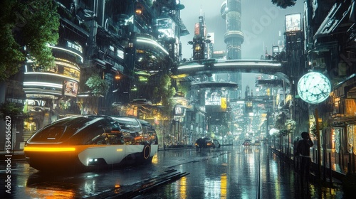 Futuristic cityscape at night with neon lights, advanced vehicle, rain-soaked streets, and towering skyscrapers