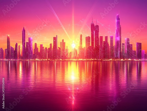 Futuristic Cityscape at Sunset with Networked Connections Overlayed