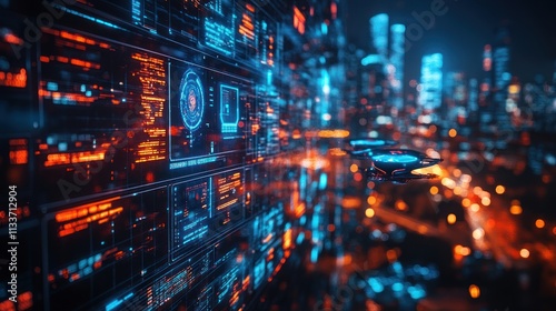 Futuristic Cityscape: Drone Flight Over Neon-Lit Metropolis with Digital Interface
