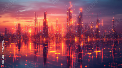 futuristic cityscape glows with vibrant orange and red lights, reflecting on calm water surface. digital skyline is filled with towering structures, creating mesmerizing, sci fi atmosphere