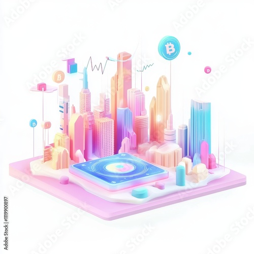 Futuristic cityscape illustration with digital finance elements, colorful abstract design.