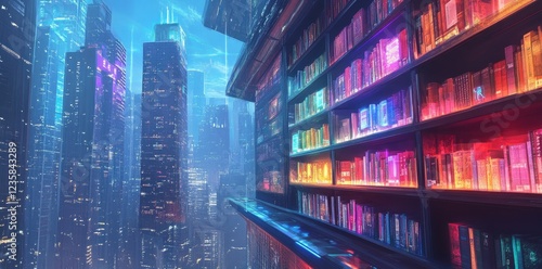 Futuristic Cityscape Library Bookshelves Neon Lights
