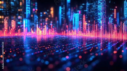 Futuristic cityscape neon skyscrapers reflecting on a digital grid surface