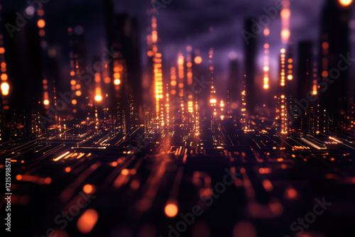 Futuristic cityscape with glowing lights and digital elements.