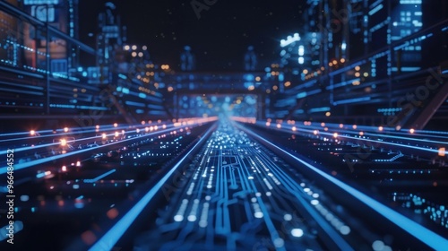 Futuristic Cityscape with Glowing Rails
