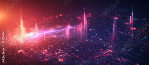 Futuristic cityscape with glowing skyscrapers and lights in a digital landscape.