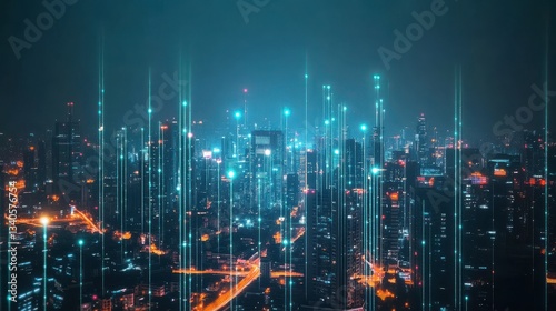 Futuristic cityscape with glowing structures and digital pathways, showcasing advanced urban innovation.