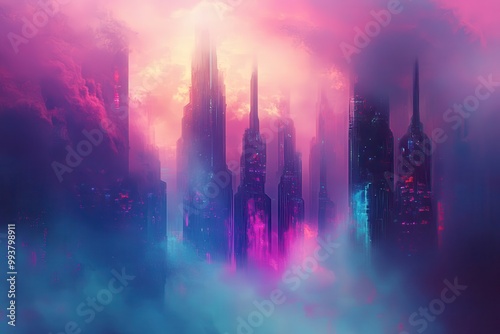 Futuristic Cityscape with Glowing Towers Emerging from the Clouds