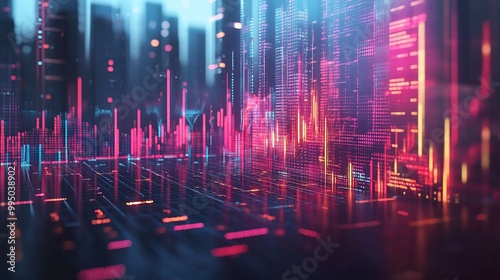 Futuristic cityscape with neon digital data visualizations and glowing graphs, representing technology and innovation.