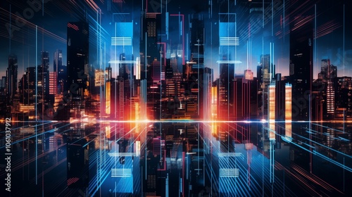Futuristic cityscape with neon lights and reflective surfaces, showcasing a vibrant urban environment.
