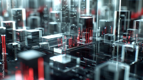 Futuristic cityscape with red data streams and 3D buildings in digital visualization