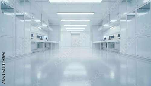 Futuristic cleanroom with bright lighting and reflective surfaces, emphasizing sterile, modern, and high-tech environment suitable for laboratory work.