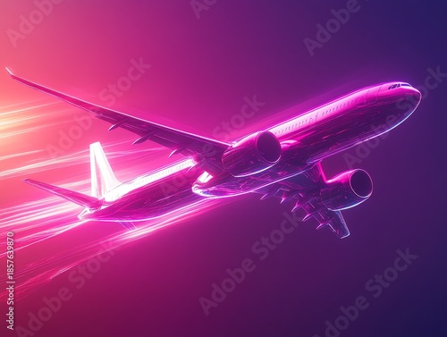 Futuristic Commercial Jet Airplane Flying at Night with Neon Pink and Purple Light Trails