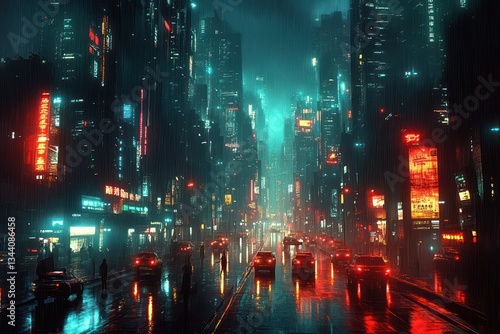 Futuristic Cyberpunk Cityscape at Night with Neon Skyscrapers and Reflective Streets