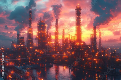 Futuristic Cyberpunk Oil Refinery with Neon Lights and Dramatic Sunset