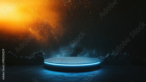 Futuristic dark podium with a glowing blue halo set against a starry cosmic background dramatic sci-fi scene for modern presentations
