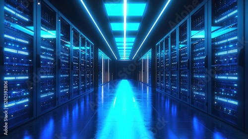 Futuristic data center with glowing blue server racks and sleek reflective floors, showcasing advanced technology and high-security infrastructure. Ideal for cloud computing, cybersecurity, and AI