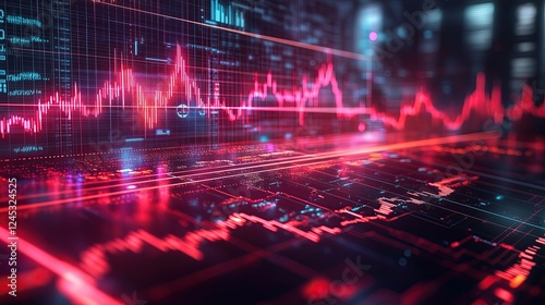 Futuristic data visualization with vibrant red graphs and digital patterns.