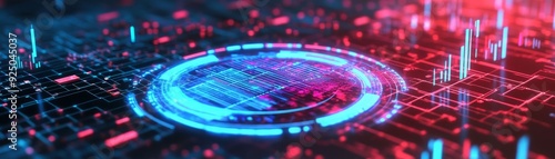 Futuristic digital abstract background with neon lights, data visualization, and circular patterns in vibrant colors.