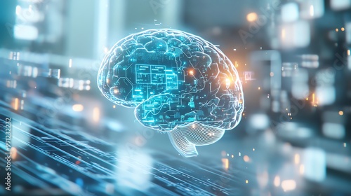 Futuristic digital brain hologram in a high-tech environment, showcasing advanced technology, artificial intelligence, and neural networks.