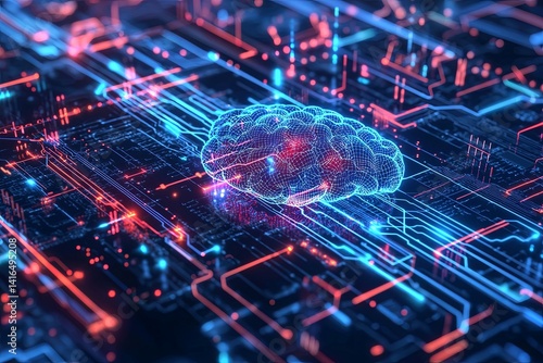 Futuristic Digital Brain in a Technological Environment with Neon Blue and Red Circuit Patterns Representing Advanced AI Concepts and Neural Networks