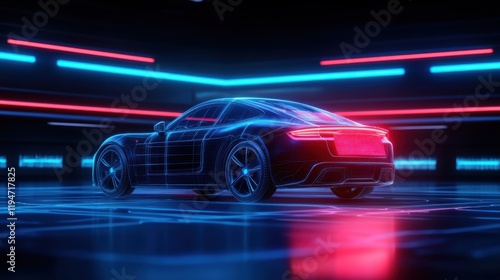 Futuristic Digital Car Concept with Neon Lights and 3D Wireframe Design in Dark Environment