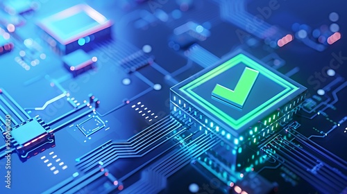 Futuristic digital circuit board with glowing check mark symbolizing technology, success, and security in a high-tech environment.