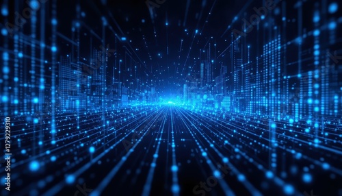Futuristic Digital Cityscape with Blue Light Trails and Grid Effect
