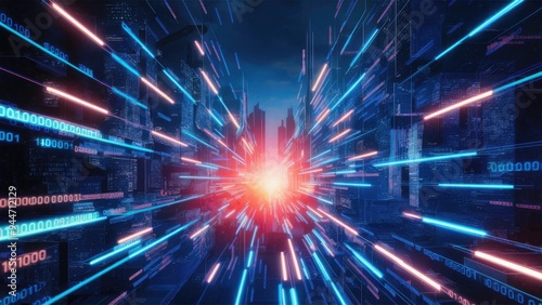 Futuristic digital cityscape with vibrant neon lights, showcasing streams of binary code and cutting-edge technology in a virtual setting.