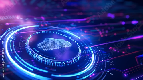 Futuristic digital cloud technology concept showing a vibrant and connected network with glowing lights and circuits.