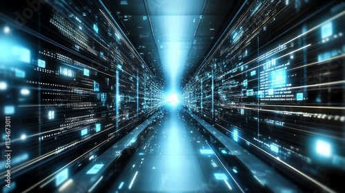 Futuristic digital corridor with glowing blue lights and data streams. Represents advanced technology, innovation, and high-speed information transfer in a sci-fi setting.