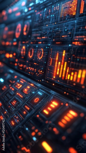 Futuristic digital data dashboard with neon orange interface and analytics visuals