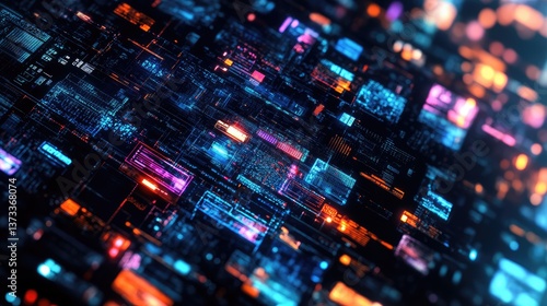 Futuristic digital display showing integrated technology across multiple devices. Empty space for text.