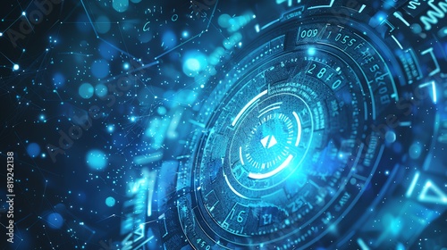 Futuristic digital interface with glowing blue elements and data visualization in a high-tech science fiction concept.