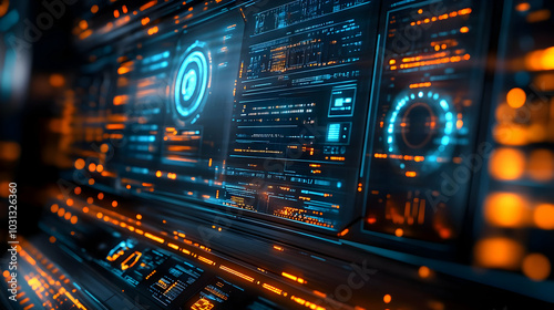 Futuristic digital interface with glowing elements and data displays.
