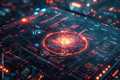 Futuristic digital interface with glowing red and blue lights, showcasing advanced technology and cyber elements in a high-tech environment.