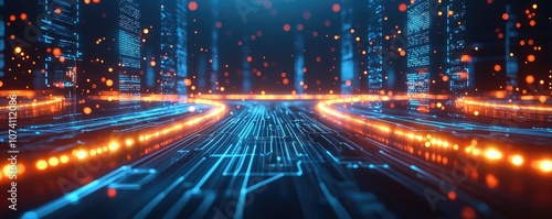 Futuristic digital landscape with glowing circuits and vibrant lights.