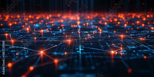 Futuristic Digital Network Visualization with Bright Blue and Orange Lights